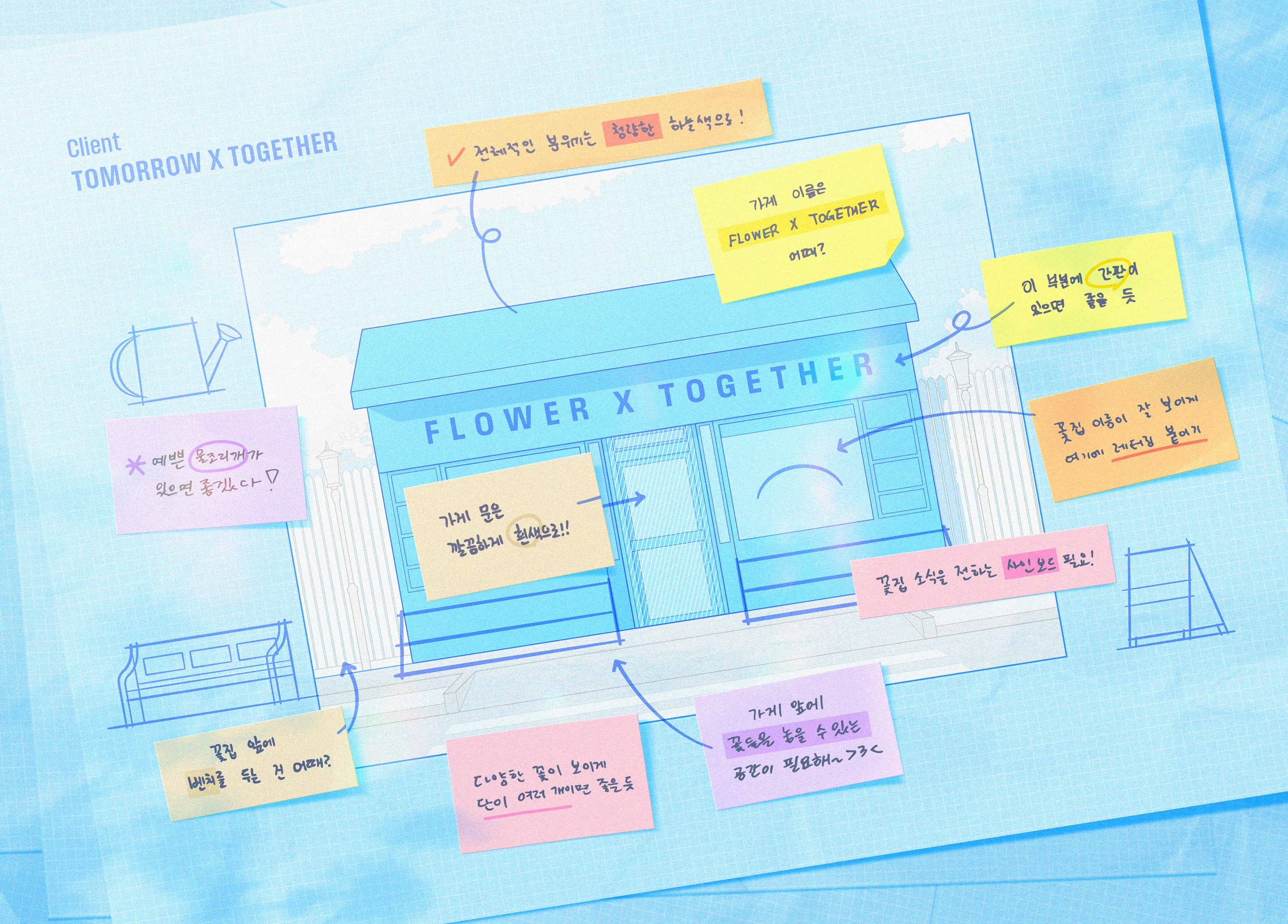 The 2021-2022 collection was first announced on HYBE Merch's Twitter account on September 13, 2021, with the announcement of Yeonjun's merch available for pre-order.[1] The second collection titled "Bake Shop" was first announced on August 24, 2022 on HYBE Merch's Twitter account.[2] The 2023-2024 collection titled "Flower Shop" was first announced on August 24, 2023 on HYBE Merch's Twitter account.[3] The 2024-2025 collection titled "With Love" was first announced on August 28, 2024.[4] The members have participated the overall design process of the merchandise in this collection. A collaboration with PPULBATU titled "Heart Messenger" was announced on September 1, 2025 for the 2025-2026 collection.[5]